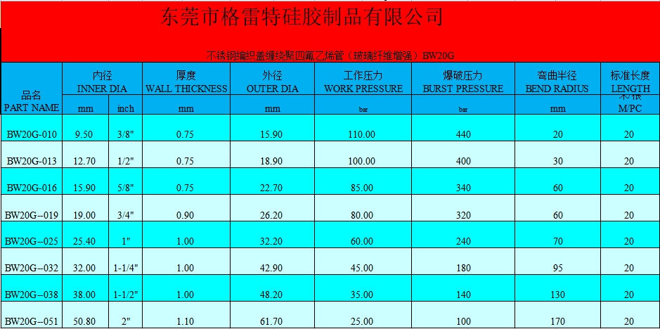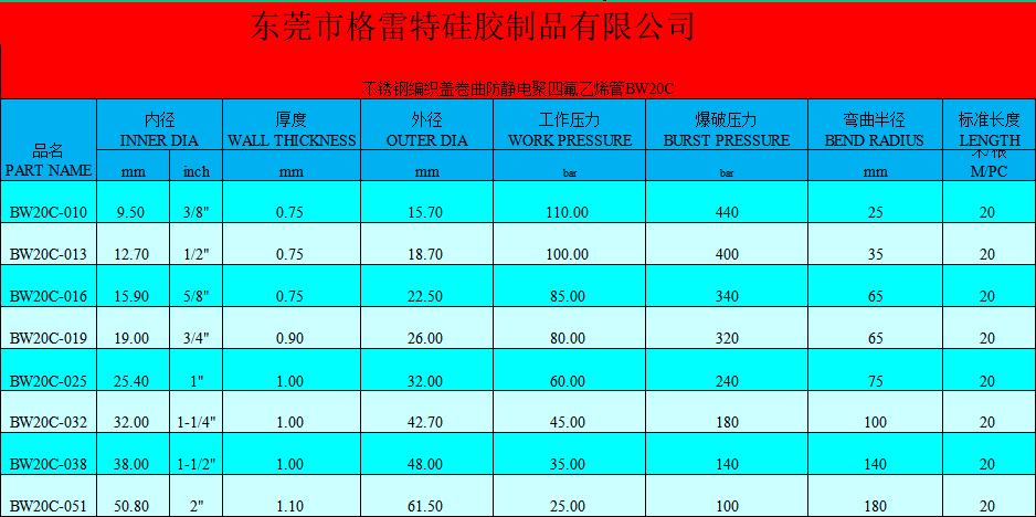 用于输送腐蚀性化学品、热风、热油、蒸汽.BW20C可以抗静电。